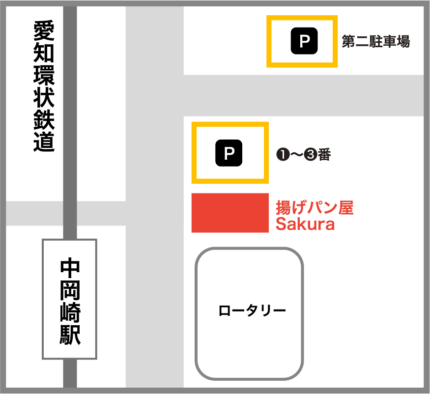 愛知環状鉄道「中岡崎」駅 徒歩約1分店舗横に①〜③の駐車場をご用意しています。